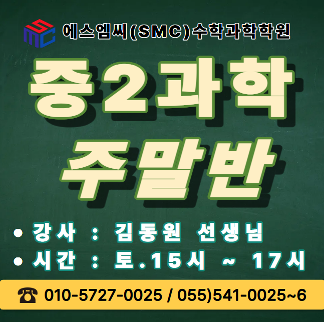 안녕하세요 에스엠씨(SMC)수학과학학원입니다. <중2과학 주말반> 안내해드리겠습니다 저희 학원은 소수정예로 구성되어 있어 학생들에게 집중적으로 지도합니다. 단순히 문제를 푸는 것에 그치지 않고 문제의 핵심 포인트를 정확히 파악하고 이해를 바탕으로 수업을 합니다. 자세한 교육과정이 궁금하시다면 언제든지 학원으로 연락주시기 바랍니다. 통화가 어려운 경우 문자 남겨주시면 연락드리겠습니다. ex) 학교/학년/문의내용(간략히) 문의 : 055-541-0025 / 010-5727-0025 <img src="https://blogthumb.pstatic.net/MjAyNjA0MjFfMjk4/MDAxNzc2NzY2MTI0NDY4.9b0W2pxuXwsb1ViROG2e6Ga-vVGJw2DChBNi8LJ4jAYg.UyFcS6CWBKGGf5brFmi8kcAkH7_zWu2QUbLcqq_axF8g.PNG/image.png?type=s3" />