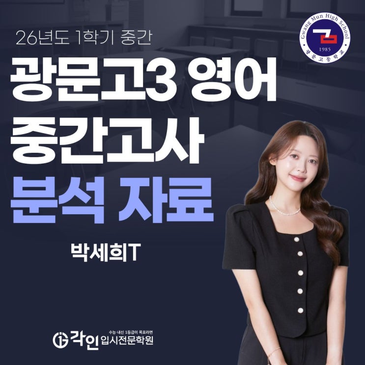 광문고 3학년 1학기 영어 중간고사 분석 by 박세희T ➡광문고 3학년 기말대비 정규반 : 일 오후 6:00 ~ 오후 9:30 (5/10 개강) 광문고 영어, 각인이 압도적입니다. 상담/문의 02-6497-2471 <img src="https://blogthumb.pstatic.net/MjAyNjA0MzBfMTEw/MDAxNzc3NTM5NTQ0MTMy.ez8XsCStlkj7SCEPiLMMBt-zyEC61zMaMF9EEz3mmCYg.DZEsxAd6gzjJrUcyeSBEzDSYLA9wZ3E7v6ruWMmOisQg.JPEG/26%B3%E2%B5%B5_1%C7%D0%B1%E2_%C1%DF%B0%A3_%C3%D1%C6%F2_%283%29.jpg?type=s3" />