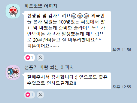 외국인 앞에서 영어로 발표 성공! 안녕하세요 오늘은 단순한 학습 후기가 아니라, “영어를 배운 이유를 실제로 증명한” 수강생의 리얼 경험을 소개해드리려고 해요 해외 본사 발표… 그리고 실제 상황 한 수강생분께서 약 100명이 참여하는 자리에서 영어 발표를 진행하게 되었는데요! 발표 준비를 위해 프랙톡에서 함께 준비했죠! 슬라이드노트가 안보이는 사고가 발생했다고해요! 그런데 놀랍게도, 영어로 20분 동안 자연스럽게 대처하며 발표를 마무리 하셨다고 합니다 그리고 남긴 한마디: “덕분이에요~~” 어떻게 이런 결과가 나왔을까요? 프랙톡 수업의 핵심은 ‘실전 영어’ 입니다 단순히 문법, 단어 외우는....... <img src="https://blogthumb.pstatic.net/MjAyNjA0MTRfODIg/MDAxNzc2MTU3NjI3Nzg0.TOeET39jKBR0L1evxESICcuKGaHEOJMBqLEYEkbt0uYg.SpHbW13ry8W3ljOXeeSlaecP2tu3Rg5OkXPwV33uukcg.PNG/kakao_screenshot1776156461939.png?type=s3" />