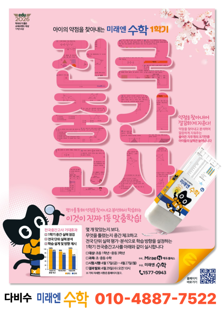 미래엔 수학에서 전국단위로 실시하는 중간고사가 곧 시작됩니다!! 저희 미래엔 수학 새솔센터에서는 재원생 모두 중간고사를 봅니다. 그동안 공부한 내용을 점검 받고 전국단위시험으로 자신의 실력과 위치를 객관적으로 평가하여 앞으로의 학습방향을 설정하기 위함입니다.^^ 1학기 중간 실력 점검!! 전국단위 실력 분석!! 학습 설계 및 방향제시!! 재원생이 아니어도 신청가능합니다. 우리아이의 실력을 객관적으로 파악하고 싶으신 학부모님들은 무료로 신청가능하니 언제든 연락주세요^^ 시험시행 : 2026년 4월 17일(금)~4월 27일(월) 결과발표 : 2026년 4월 29일(수) 오전 10시 <img src="https://blogthumb.pstatic.net/MjAyNjA0MDdfMjYz/MDAxNzc1NTM2OTA1ODE5._puTr9MfWEzNOy9SHIbhCrrirIkxdFIOPj4pRtfp7fMg.Mcg1ps6KEaEqlrl-uQ1HZpcoftwsftfEDAUButRZOEsg.PNG/%C1%DF%B0%A3%B0%ED%BB%E7%C0%FC%B4%DC26%B3%E21%C7%D0%B1%E2.png?type=s3" />