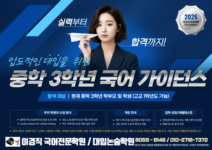 <중학 3학년을 위한 국어 학습 가이던스 설명회> 중학 3학년은 대입 방향이 사실상 결정되는 중요한 시기입니다. 그러나 상위권 대학 진학에 요구되는 정보와 체계적 학습 전략을 충분히 접하지 못하여 노력이 수포로 돌아가는 사례가 적지 않습니다. 이로 인한 학생별 실력 격차는 '국어'에서 가장 먼저 드러납니다. 국어는 수능의 성패를 좌우하는 핵심 과목이자 전 교과 성취를 견인하는 ‘사고력의 기반’입니다. 상위권 대학교일수록 국어성적의 변별력은 가히 절대적입니다. 이에 본원은 ‘(압도적인 대입을 위한) 중학교 3학년 을 위한 국어 학습 가이던스 설명회'를 통해, 지역적 한계를 넘어설 전략과 학습방안을....... <img src="https://blogthumb.pstatic.net/MjAyNjA0MTNfMjcx/MDAxNzc2MDMwMzExNzY2.DYy6ZIj6YE9tdoxha8C_GWY-InpqpvT9ooelZDhV7kgg.vRPZZ_el4TauUvrQQU4ZbgAZZk0L4GNQptAUhKby3i4g.PNG/1.png?type=s3" />
