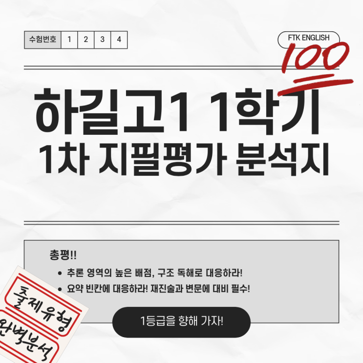안녕하세요! #FTK향남캠퍼스 입니다! 하길고 1학년 1학기 1차 지필평가 영어 시험이 마무리되었습니다. 중학교 졸업 이후 처음 맞이하는 고등학교 지필 평가였을텐데 용감하게 지필평가에 참여해 준 학생들에게 많은 박수 부탁드립니다! 중학교 내신 시험에 비해 모의고사 유형의 문항이 다수 등장하고 무엇보다 지문의 범위가 크게 많아져 더욱 꼼꼼한 대비가 필요했을 것입니다. 추론형 문제와 요약 빈칸 문제가 가장 높은 비중을 차지한 것이 이번 지필평가의 특징으로 구조 독해와 재진술 역량을 길러야 2차 지필평가에서 더 향상된 결과를 기대해볼 수 있을 것입니다. 고등학교 1학년 그 첫 시작을 장식한 이번 #하길고등학교 1학년 1차 지....... <img src="https://blogthumb.pstatic.net/MjAyNjA0MjBfMjcg/MDAxNzc2Njk1OTk3MTI2.K2vlf8ky6z0NZ5YLx4BVSYe1Cv6S55zn2NIE1ZLUC08g.kiAwcOEF689JA_HvFUAN_OblqtpUV0xB0NU7HEk6DsEg.PNG/1.png?type=s3" />
