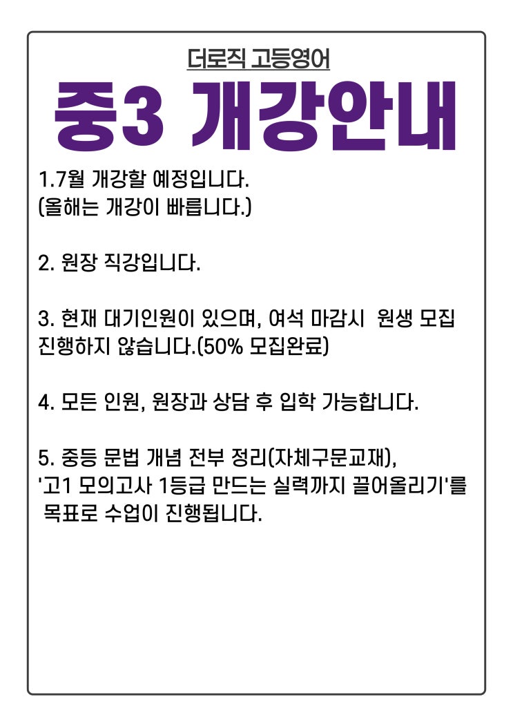안녕하세요. 더 로직 고등영어입니다. 중3 모집 안내입니다.(7월 중순예정) 올해는, 작년에 비해 개강을 일찍합니다. (올해는 중3 학생들을 더 공부 시키고 고등과정을 시작하려고 합니다.) 중등과정 문법 개념 정리(자체교재, 원장강의) + 고1, 고2모의고사 1등급 실력까지 만드는게 목표인 강의입니다. 1) 중학교 내신은 길면 일주일만 강의합니다. (하루면 진도 다 빼며, 자료는 미리 다 세팅해줍니다.) 2) 중등 문법 개념 없어도 다 만들어드립니다. (단, 제가 문법 정리할 때, 같이 열심히 공부해주시면 됩니다.) 3) 원장 직강입니다. (모든 클래스 제가 직접 가르칩니다. 따라서, 원생 모집이 제한적입니다.) 4) 처음부터 배우는 걸 권장합....... <img src="https://blogthumb.pstatic.net/MjAyNjA0MTNfMjQ5/MDAxNzc2MDYxMzQ0ODgw.4BOljnvaCmkwceCrBBmaK6zKWhONkAmpEcKCgYwXmK0g.94Qt7148cFjeJDXbcKNall8iVQnPzNKQ5TRSfIQUlh0g.JPEG/%C1%A6%B8%F1%C0%BB-%C0%D4%B7%C2%C7%D8%C1%D6%BC%BC%BF%E4_-003_%287%29.jpg?type=s3" />
