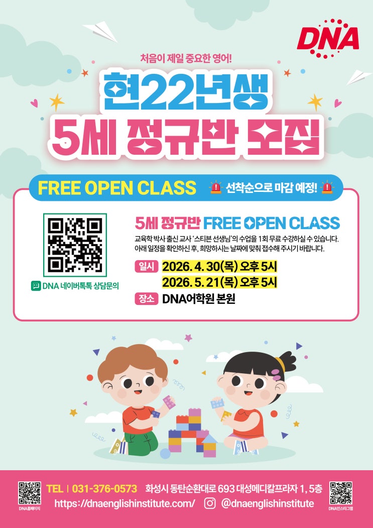 반갑습니다!☺️ 행복한 아이들이 더 많이 배우고 성장한다는 "Happy Kids, Learn More" 모토로 아이들을 열심히 가르치는 DNA 입니다. 아이의 첫 영어, 아무렇게나 시작할 수 없습니다. DNA 강사진 100% 북미출신 (Only 미국 & 캐나다) DNA English 프리미엄 유치부 프로그램 ✅ DNA 5세 정규반 (Open Class) 핵심 컨셉 “영어는 처음이 전부입니다” 이 시기는 ✔ 잘하면 평생 자신감 ✔ 잘못하면 영어 거부감 그래서 ‘어떻게 시작하느냐’가 가장 중요 수업 방향 1️⃣ 놀이처럼 시작, 하지만 체계적으로 그냥 놀기 ❌ 그냥 영어노출 ❌ 놀면서 배우지만, 설계된 수업 2️⃣ 영어를 ‘귀로 먼저’ 배....... <img src="https://blogthumb.pstatic.net/MjAyNjA0MTNfMjk1/MDAxNzc2MDcxNzc2MjY2.Zgdb5yNo3F5CduSs2NLTkcErxKQoTQq7BQzXv0jv0o4g.5YZMcF_X5EA0VjeRJCT6uiA5Aj2oR7loNYo3ONXpqSgg.JPEG/DNA_%C3%BC%C7%E8%C0%CC%BA%A5%C6%AE%285%BC%BC%29.jpg?type=s3" />