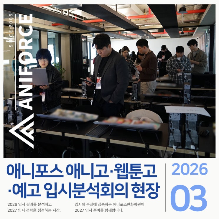 안녕하세요:) 꿈과 미래를 그려나가는 동탄 오산 수원 용인 평택 만화 웹툰 애니 게임 포폴 입시 미술 학원 동탄 애니학원 애니포스 입니다. 주요 대학 입시분석회의 이후, 2026년 3월 23일(월) 대치 애니포스에서 2026년 애니포스만화학원 애니고·웹툰고·예고 입시분석회의가 진행되었습니다. 2026년 애니고·웹툰고·예고 입시분석회의 애니고학원 중 애니포스만화학원은 만화·애니메이션·게임 관련 대학 입시는 물론, 애니고 및 웹툰고 입시까지 함께 운영하며 체계적인 입시 대비를 이어가고 있습니다. 이번 분석회의는 전국 캠퍼스 원장단과 강사진이 한자리에 모여 최근 입시 결과를 바탕으로 흐름을 정리하고, 애니고와 웹툰고, 예고 입시의....... <img src="https://blogthumb.pstatic.net/MjAyNjAzMzFfMTcx/MDAxNzc0OTQ1NzU3OTY5.RBfDmXZUicbpXRXyyAg3eNy-fZUWSLGivPwEiMdj9mAg.XkeRvIkh7_5-CtXdSHB2wPH71AQJ3tB0EGJjLoYtv0Ag.JPEG/%BE%D6%B4%CF%C6%F7%BD%BA%B8%C5%B0%C5%C1%F8_%BB%E7%C1%F81_%C1%A4%B9%E6%C7%FC%C5%DB%C7%C3%B8%B42.jpg?type=s3" />