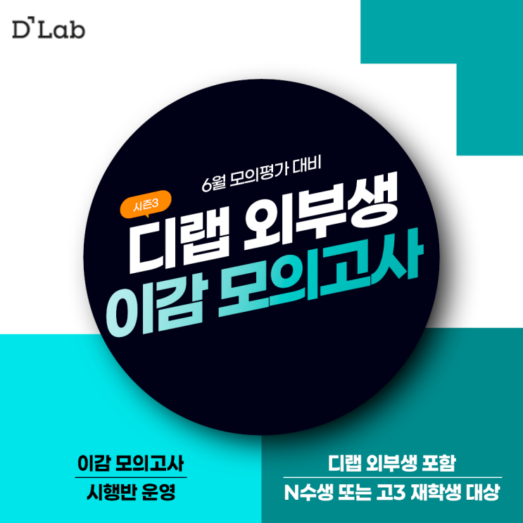 안녕하세요. 대성학원이 만든 독학재수학원, 디랩입니다. 6월 모의평가 결과를 바꾸는 마지막 실전 점검 수험생에게 6월 모의평가는 단순한 연습 시험이 아닙니다. 현재 자신의 성적 위치를 객관적으로 확인하고, 이후 학습 전략을 결정하는 중요한 기준점이기 때문입니다. 하지만, 6월 모평을 앞두고도 실제 시험 환경과 동일한 긴장감과 루틴 속에서의 경험이 부족한 학생들이 많습니다. 이에, 이러한 부분을 보완하기 위하여 DLab에서 외부생도 참여 가능한 ‘이감 모의고사 시즌3’를 운영합니다. DLab 이감 모의고사는 단순한 문제풀이를 넘어, ✔ 실제 시험장과 유사한 환경 ✔ 검증된 이감 콘텐츠 ✔ 대치동 기준 데이터 기반 성적 분석까....... <img src="https://blogthumb.pstatic.net/MjAyNjA0MTRfMTMz/MDAxNzc2MTU1NzQzMjM2.A29Hv6-cF1ygWwmk1EoL10mHvR2B60uQ3q_HALOBqNMg.Y6PS8hym2o2bvCwOmAgi_xWfFjqApM1scq8PHTII23Ag.PNG/%BC%B6%B3%D7%C0%CF_%BC%F6%C1%A4%BA%BB.png?type=s3" />