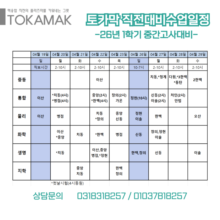 [동탄과학학원] 토카막과학 1학기중간고사 직전대비일정 & 1학기 기말고사 시간표안내
