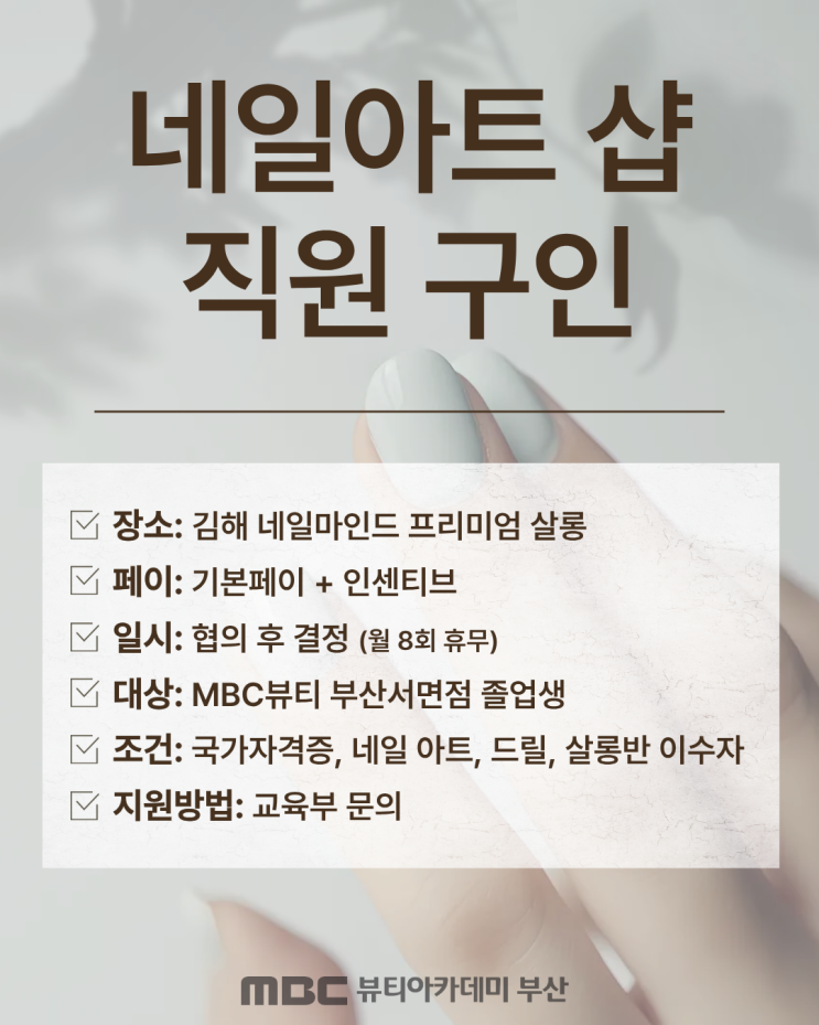 네일아트로 취업까지 연결되는 기회✨ 프리미엄 살롱 취업, 생각보다 더 가까이에 있어요 단순 기술이 아닌 실무 + 감각까지 제대로 준비된 분들만 가능한 자리입니다 관심 있는 분들은 편하게 문의 주세요 :) #네일취업 #네일아트 #부산네일 #김해네일 #네일리스트 #뷰티취업 #엠비씨뷰티아카데미 #취업연계 찾아오시는 길 http://pf.kakao.com/_hxciBxd/chat 위치: 중앙대로 707 문용빌딩 4층, 5층 상담 문의: 051-804-4777 Instagram: https://www.instagram.com/mbc_busan/ 카카오톡 상담 바로가기: http://pf.kakao.com/_hxciBxd/chat <img src="https://blogthumb.pstatic.net/MjAyNjA0MTVfMjMy/MDAxNzc2MjQyNTUyMzcz.2DO9MCM6SfsATVPmJU7K7s1F3mg0lD0q1Tf4ytuYcYIg.VMU8qpUtZoeguYzV3sxDY6EsDo31Cs_fsXsIP0FEBa8g.PNG/%B3%D7%C0%CF%B8%B6%C0%CE%B5%E5_%282%29.png?type=s3" />