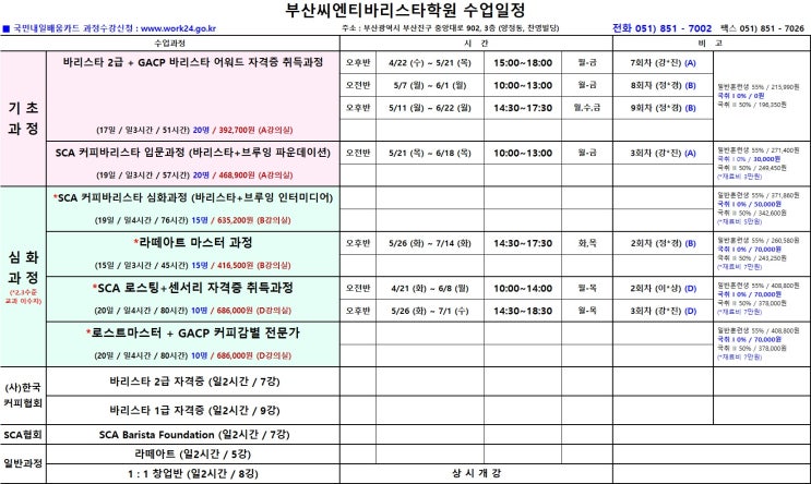4~5월 부산씨엔티바리스타학원 수업 일정입니다. 고용 24 (www.work24.go.kr)를 통해 국비 지원 수업 수강 신청 가능하시며 일반과정은 학원으로 문의 주시면 상담 도와드리겠습니다. 많은 관심과 신청 부탁드립니다. 부산씨엔티바리스타학원 051)851-7002 연락 바랍니다. 감사합니다^^ <img src="https://blogthumb.pstatic.net/MjAyNjA0MTdfMzYg/MDAxNzc2NDA2MTkyMzU3.6egNe0qeti42Y2UNYsvHsy1YlxQwBMIonR_Ij_skPjwg.Z6lytf0Ru7___TLgI3nrwsUsSyGBDOQe8aQBpQ2jCqYg.JPEG/%BC%F6%BE%F7%C0%CF%C1%A4.jpg?type=s3" />
