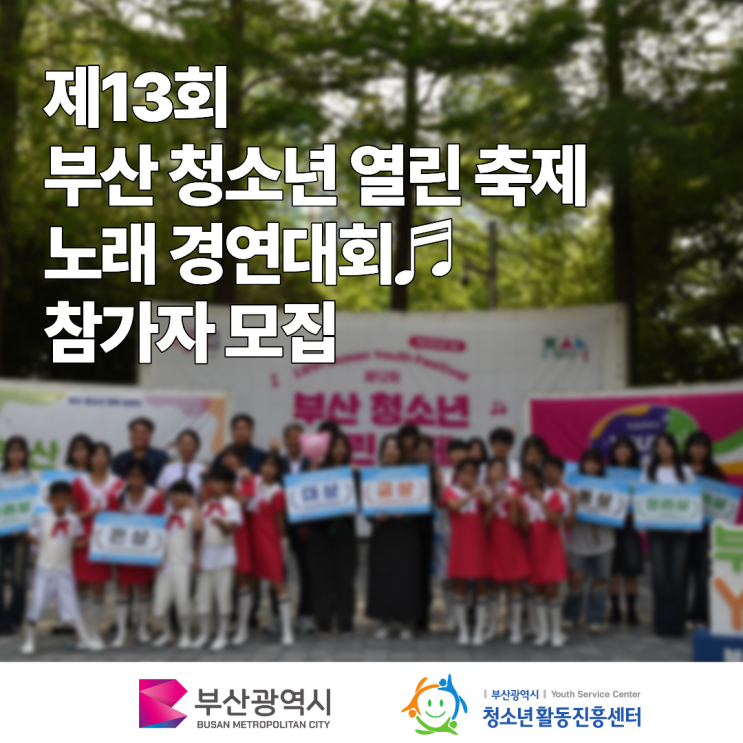 부산 가요제 소식입니다 ! 가. 행사개요 1) 행 사 명: 제13회 부산 청소년 열린 축제 2) 행사일시: 2026. 5. 23.(토) 11:00~16:00 3) 장 소: 부산시민공원 다솜마당 4) 대 상: 청소년, 학부모 등 일반 시민 5) 내 용: 체험부스, 활동마당, 노래 경연대회(본선) 등 6) 주최/주관: 부산광역시, 부산광역시청소년활동진흥센터 7) 후원(예정): 부산광역시의회, 부산광역시교육청 나. 모집개요 1) 행 사 명: 제13회 부산 청소년 열린 축제 노래 경연대회 2) 참가대상: 부산지역 청소년 (9세~24세) 누구나 3) 모집기간: 4. 7.(화)~4. 23.(목) 4) 심사기간: (예선)4월 5주 영상 심사/ (본선)5. 23.(토) 현장 심사 5) 분 야: MR을 활용한 전 장르의 노래....... <img src="https://blogthumb.pstatic.net/MjAyNjA0MTdfMTUw/MDAxNzc2NDA3MTQ5NDE0.nQiN-i1lq7zalQxwiMdqfSEFhfAJOZbc35vF3Eq9FNQg.e-QTUlrezn3hxLJF5aaic-aLwmynALJV5MhQZafgKUEg.PNG/%B4%D9%BF%EE%B7%CE%B5%E5.png?type=s3" />