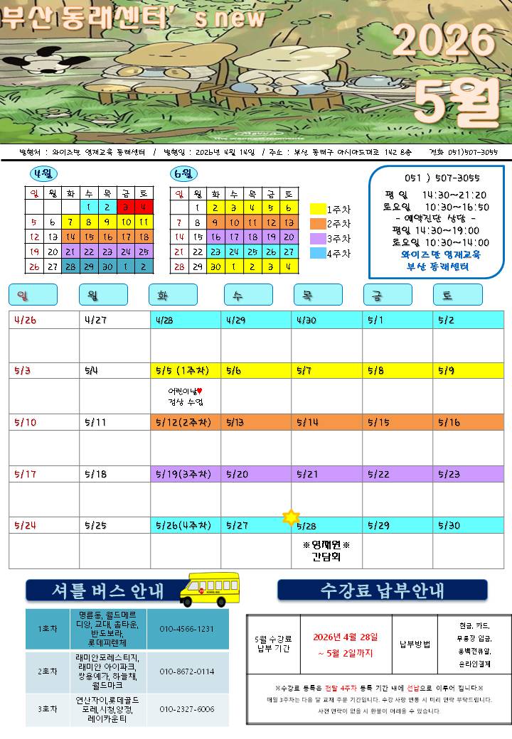안녕하세요 동래와이즈만 입니다 5월 소식지 안내해드립니다 5월 소식지에서 챙겨봐주실 점!!! 5월 5일 어린이날 와이즈만은 정상수업입니다. (결석예정인 친구들은 미리 연락주셔서 청강 잡으시길 바랍니다) 5월 28일 영재원 설명회가 오후 7시40분에 열립니다. 6월에는 한달 프로젝트 수업이 진행될 예정이니 추후 안내하겠습니다~ 감사합니다 문의 카카오톡, 톡톡, 전화 <img src="https://blogthumb.pstatic.net/MjAyNjA0MTRfOTcg/MDAxNzc2MTQ4OTg3MzEz.FsqYyssVXWwn61bubVUJLnRmCfetNbnMi1tr5RqcwMcg.UC6PSS0OukyqAV2fcFz6x_uosIPc5Fs3XBxXTNaZMT4g.JPEG/%BD%BD%B6%F3%C0%CC%B5%E51.JPG?type=s3" />