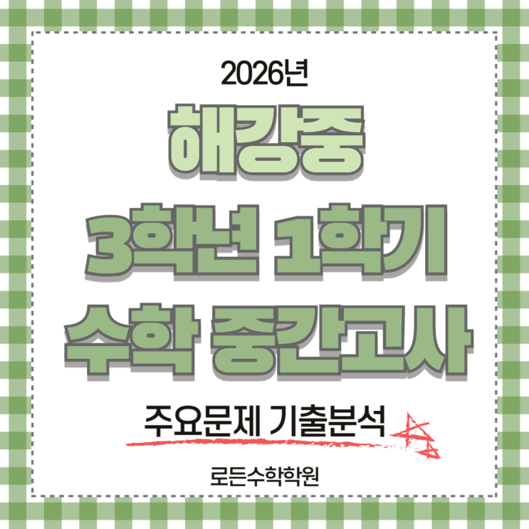 안녕하세요, 로든수학학원입니다. 오늘은 2026년 해강중학교 3학년 1학기 중간고사 수학시험 주요문제 기출분석을 해보려고 합니다. 해강중3 1학기 중간고사 시험범위 해강중3 1학기 중간고사 시험범위는 1-1단원 : 제곱근과 실수 1-2단원 : 근호를 포함한 식의 계산 2-1단원 : 다항식의 곱셈 2-2단원 : 인수분해 으로 진행이 되었습니다. 해강중3 단원별 문제 출제 수 주요문제 기출분석 [ 해강중 10번 문항 및 손풀이 ] [ 해강중 15번 문항 및 손풀이 ] [ 해강중 16번 문항 및 손풀이 ] [ 해강중 서답형 6번 및 손풀이 ] 난이도 및 총평 로든수학학원이 평가하고 체감한 이번 해강중 3-1 수학 중간고사 난이도는 "중" 정도로 파악되....... <img src="https://blogthumb.pstatic.net/MjAyNjA0MjRfMjE5/MDAxNzc3MDE4NDIxNzg2.CPewQI_PVrrQTADmenTBZEvma-4yj3_dN93AXHKWNukg.juHU3AyPBxQ-dJrKmEjcsKl_ytlHZ0QLf6_EHNMCDfsg.PNG/001.png?type=s3" />