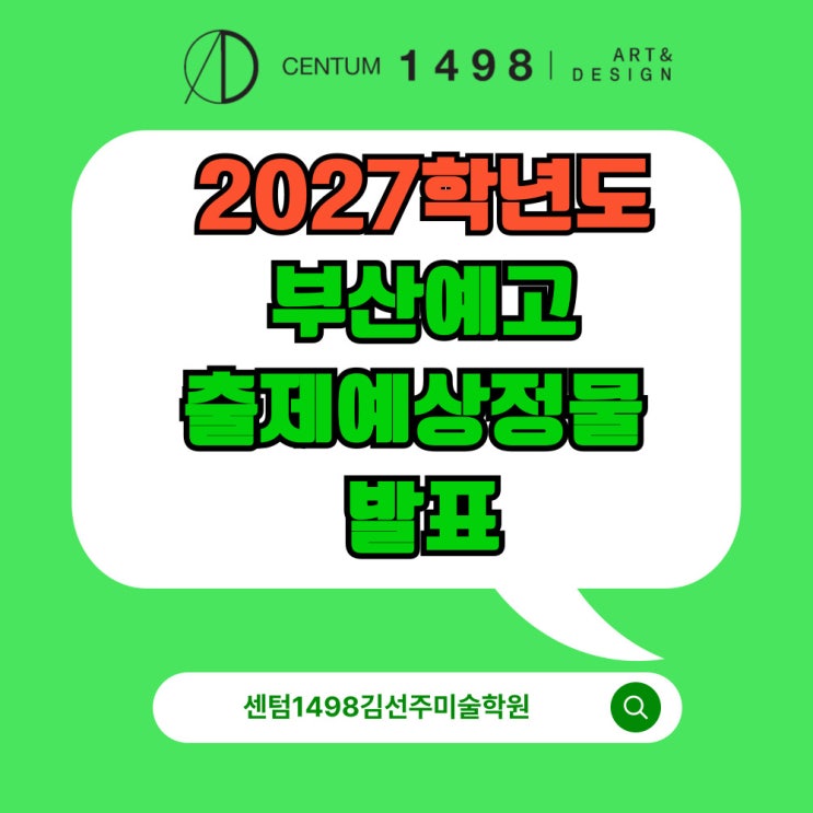 안녕하세요! 센텀1498김선주미술학원입니다. 오늘 포스팅은 부산예고에서 공개한 2027학년도 부산예고 입시 미술과 실기고사 출제 예상 정물 목록을 공유하려합니다. 바로 확인해보러 가실까요? 2027학년도 부산예술고등학교 고입 실기고사 출제 예상 정물 주전자, 도자기, 축구공, 손가방 곰인형, 화분류, 캡모자, 체크천, 전구, 고무장갑 총 10종의 정물이 공개되었습니다. 자세한 이미지와 함께 보실까요? 위와 같은 총 10개의 후보 기물 중 5개의 기물이 실기고사 3일 전후로 화지의 방향 등 실기고사 조건과 같이 홈페이지에 발표됩니다.. 출제 예상 정물 외 실기고사 관련 세부 정보입니다. 평가시간: 3시간 30분 화지크기:4절지 더 자세한....... <img src="https://blogthumb.pstatic.net/MjAyNjA0MjRfMjMy/MDAxNzc3MDIwMzEyNjg2.E5XwWnyy5ReSFKYKhq-HeRcsELgtRlhjeCC1mvylt5Ig.Lf_q3PYnxeljUR9_UrnBEa_eAw_2cbini9AdHHvfniMg.JPEG/%C1%A6%B8%F1%C0%BB-%C0%D4%B7%C2%C7%D8%C1%D6%BC%BC%BF%E4_-006_%282%29.jpg?type=s3" />