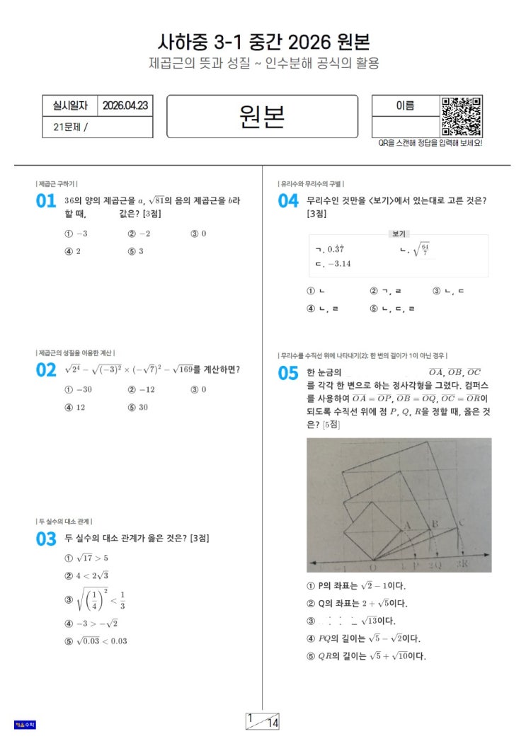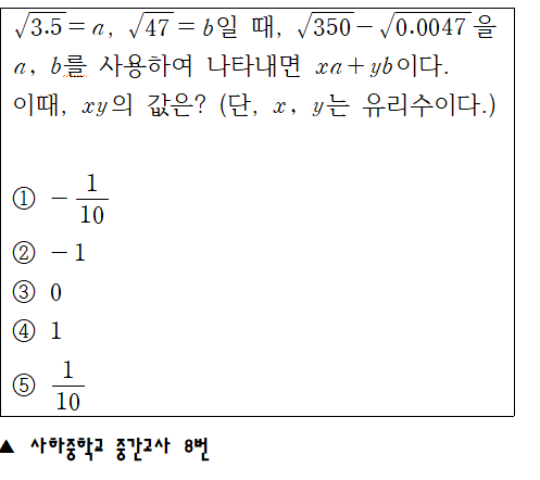 안녕하세요! 제니스 학원입니다. 오늘은 사하중학교 시험이 있었습니다. 저희 학원에 가장 많은 학생이 다니는 사하중학교에서 100점이 무려 3명이나 나왔답니다! 문제 리뷰 가겠습니다! 8번입니다. 제곱근의 성질을 이용하여 루트안에서 백배는 밖에서 10배와 같다는 원리를 이용한 문제겠죠? 합차공식을 주고, 합차공식을 이용한 보기를 고르는 무난한 문제입니다. 다른건 괜찮지만 ㄷ에서 유리화를 할 때도 합차공식을 이용하므로 잘 해결해야 할 것입니다. 겉보기엔 난해해 보이지만, 이차항의 계수고 1로 주어져 있고, 곱이 -18로 주어져 있어, 케이스가 많지 않습니다. 그래서 곱해서 부호가 다른 두 수를 열거해 안나오는 케이스를 빠르게....... <img src="https://blogthumb.pstatic.net/MjAyNjA0MjNfMTk0/MDAxNzc2OTM1MjAzNTIx.zfhcE4tDuhrV9eLe2LlBRleaXACi9G43H5zZUVRvr3gg.jr1G_7IJ4aFQF86-gIqQR2_OLfOpwweC-ZlXgY8Kr1Yg.PNG/%C8%AD%B8%E9_%C4%B8%C3%B3_2026-04-23_180630.png?type=s3" />