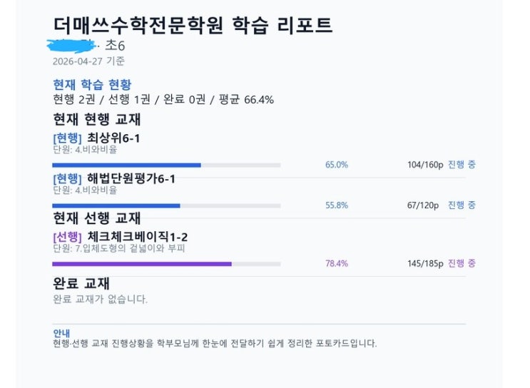학원은 다니는데 우리아이 어떤교재를 쓰는지 어디쯤 진행되고 있는지 궁금하셨죠? 듣긴 들어도 기억하기 쉽지 않기도 하구요 특히 완료된 지난교재를 알기는 더 어렵답니다 그래서 더매쓰에서는 학부모님들께 더 자세한 정보를 드리려고 노력한답니다 아이의 현재 상황을 잘 알고 있어야 미래 설계도 가능 하니까요!! <img src="https://blogthumb.pstatic.net/MjAyNjA0MjdfMTUx/MDAxNzc3MjczMjYxNjcy.5Kt5QH18HfX_b4uLpR3XQ-NObJ3SII5T93qwUJ_hGRgg.luJSbnpT1kn2TPyfhib4EEFkI1r-A8ugg7lru4lumZYg.JPEG/1777272461655.jpg?type=s3" />