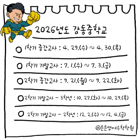 2026년도 강동중학교 1학기 중간고사 수학 시험범위 - 든든영어수학학원 안녕하세요 동호지구에 위치한 1:1 꼼꼼한 수업 든든영어수학학원입니다. 학생들의 1학기 중간고사가 2주 정도 남았습니다. 지금쯤이면 전체적인 학습이 이루어지고 한번 더 복습하는 타이밍입니다. 강동중 3학년, 2학년의 1학기 중간고사 시험범위 한번 알아보겠습니다. 3학년의 시험범위는 인수분해까지입니다. 특별한 사고력이 필요한 단원들은 아니지만 곱셈 공식 암기와 더불어서 문제를 빠르게 풀어내는 훈련을 지속적으로 해야할 필요가 있습니다. 곱셈공식의 활용이나 인수분해의 활용 부분은 시간을 많이 뺏길 수 있는 파트이기 때문에 여러 유형의 문제들을 풀어....... <img src="https://blogthumb.pstatic.net/MjAyNjA0MDhfMjIx/MDAxNzc1NjM4MDczNTcz.h-JCW8FUDnzOigXislTS-r904aiwJ06NnQfd16j15zQg.jUt3OmfE8n9uTQY1qrn1Nd-L0dZgmYEnsKr_-8Dvmu4g.PNG/image.png?type=s3" />