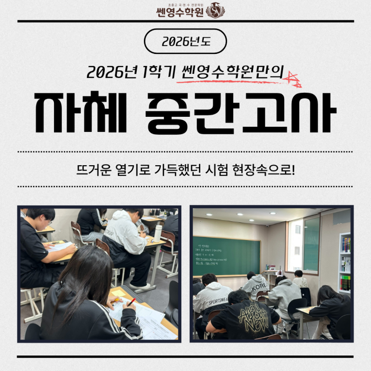 열정 폭발! 쎈영수 중등부 자체고사 현장 리포트 안녕하세요! 우리 아이들의 꿈을 함께 현실로 만들어가는 신암동 복현동 영어수학학원, 쎈영수학원입니다 지난 4월 11일 토요일, 쎈영수학원 본관, 신관, 복현점까지 '중등부 실전 대비 자체고사'로 뜨겁게 달아올랐는데요! 그 생생한 현장 소식을 전해드립니다. 긴장감 넘쳤던 시험 시간표 토요일 황금 같은 휴식 시간도 반납하고, 우리 아이들은 실전 감각을 다듬기 위해 일찌감치 신암동 복현동 영어수학학원으로 모였습니다. [본관 기준 시간표] 10:00~10:45 중2·중3 영어 11:00~11:45 중2·중3 수학 12:00~12:45 중1 수학 13:00~13:45 중1 영어 선생님들의....... <img src="https://blogthumb.pstatic.net/MjAyNjA0MTdfMzcg/MDAxNzc2NDA2MTUzMDUy.W2y3csU_w1ffwheq-YtyMHiMUlx0l_UqyQei3pG-2Lcg.2kj0mzoUgGpajc7M29h7HPcSKQ20sch2-MgkjQDZeqgg.PNG/%C0%DA%C3%BC%C1%DF%B0%A3%B0%ED%BB%E7_%B8%DE%C0%CE.png?type=s3" />