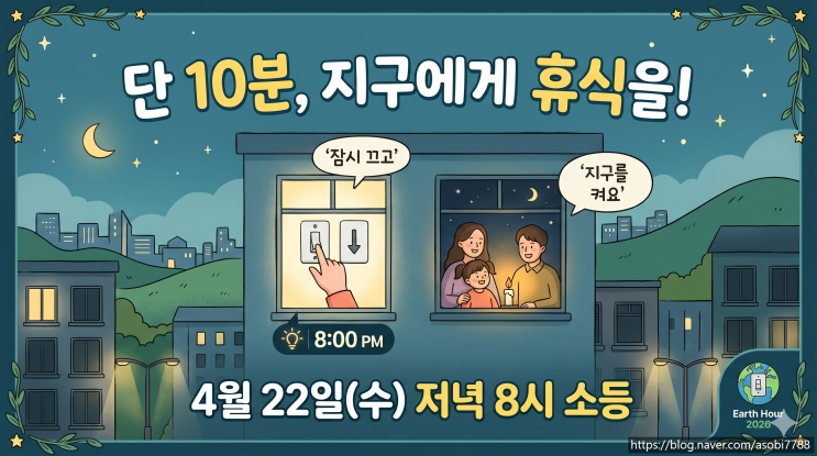 안녕하세요! 유치-초2 전문교육원 아소비 인천지사입니다 :) 여러분, 혹시 4월 22일이 무슨 날인지 아시나요? 바로 환경 오염 문제의 심각성을 알리고 지구를 보호하기 위해 제정된 '지구의 날' 입니다 매년 지구의 날에는 전 세계적으로 아주 특별한 약속을 하는데요. 바로 잠시 불을 끄고 지구에게 숨을 쉴 시간을 주는 '소등행사' 입니다. 거창한 실천도 좋지만, 우리 집 거실 불 하나 끄는 것부터 시작해 보는 건 어떨까요~? 지구의 날 소등행사, 언제인가요? 지구의 날 당일, 전국적으로 동시에 진행되는 캠페인입니다. 시간을 꼭 확인해 주세요! 일시: 2026년 4월 22일 수요일 ⏰ 시간: 오후 8:00 - 8:1....... <img src="https://blogthumb.pstatic.net/MjAyNjA0MjBfMjA5/MDAxNzc2NjUzNjczMzQ5.3KcmQVY0EjkWWa6nqg9IuznPtDUZ7rywRAOc7t1uki0g.ykoeEN9mMBcwZT2mdWx24lrjfnYgTIAvtBeVzXcSjIQg.PNG/Gemini_Generated_Image_x43jq2x43jq2x43j.png?type=s3" />