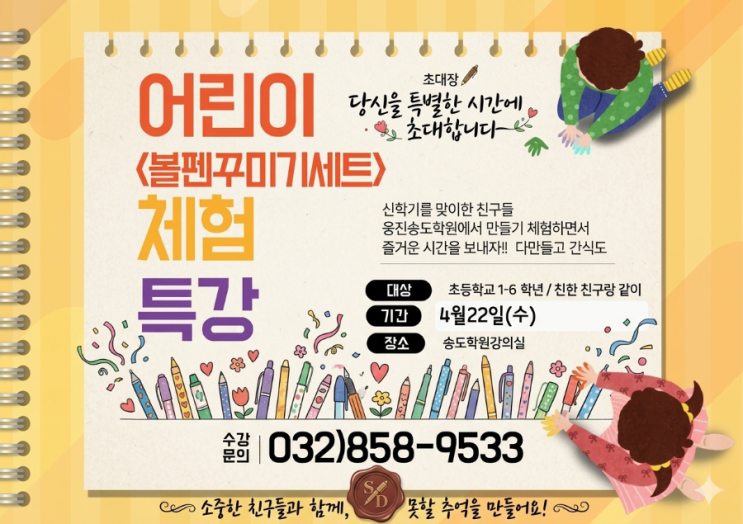 안녕하세요! 송도 김팀장입니다. 따스한 봄기운과 함께 아이들이 학교 생활에 완벽히 적응해가는 4월입니다. 우리 아이들에게 공부만큼 중요한 것이 바로 **'즐거운 성취감'** 과 **'함께하는 기쁨'**이죠? 이번에 저희 송도 학원에서는 아이들의 창의력을 쑥쑥 키워주고, 친구들과 즐거운 추억을 쌓을 수 있는 특별한 체험 특강을 준비했습니다! ️ 프로그램 안내: <볼펜 꾸미기 세트> 체험 이번 특강에서는 아이들이 직접 디자인하고 장식하는 **'나만의 볼펜 만들기'**를 진행합니다. 자신이 직접 만든 필기구로 공부하면 학습 의욕도 더 올라가겠죠? 단순히 만들기만 하는 것이 아니라, 함께 맛....... <img src="https://blogthumb.pstatic.net/MjAyNjA0MjBfMjAg/MDAxNzc2Njg4NzgyMTIx.x7cHufddwK9BLXqOrr5IijBPFBXShP8LRlXJ1DepU-Ug.1qo-Fkl-FIdPpY9fBSvmm8kwm7nk0fR6A2yFJdsdxfUg.PNG/900_1776688426651.png?type=s3" />