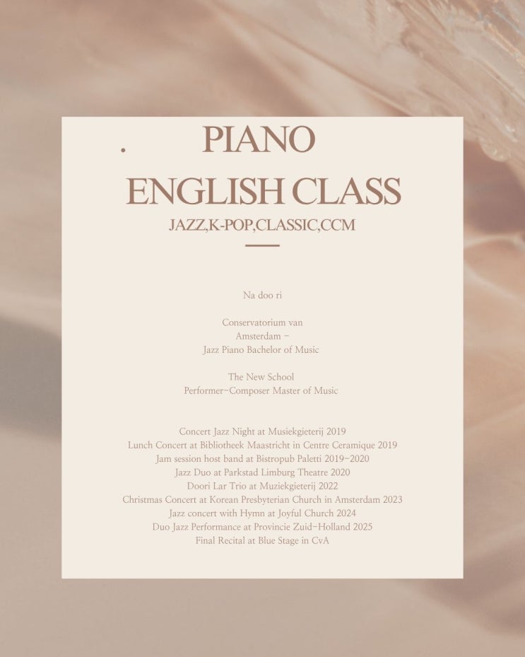 안녕하세요 파라디뮤직 아카데미 입니다. 주입식 클래식 피아노수업과는 차별화된 피아노 클래스가 개강했습니다. 수업을 맡아주실 나두리 선생님은 해외에서 오랜시간 유학생활과 음악활동을 하시다가 얼마전에 귀국하셔서 저희 파라디 뮤직 아카데미에 출강을 하고 계십니다. 클래식,재즈,k-pop,대중음악,CCM,작곡,화성학,시창청음 까지 전 장르 수업 가능합니다. 재즈,대중음악은 클래식과 다르게 창의력,창작능력,감수성등을 기르는데 탁월합니다. 본인 스스로의 감정을 표현하고 감수성,창의력을 발달하는데 좋은 영향을 미친다고 알려져있습니다. 영어수업을 희망하시는 학부모님들, 교포,외국분들을 위하여 영어 수업을 이번에 신설하였습....... <img src="https://blogthumb.pstatic.net/MjAyNjA0MjhfMTgy/MDAxNzc3MzUxMTI3MTgy.jF67YBGOCRIeDRU37hoqx-SxujLrNrWoi5b6ys7XrTgg._EpADPcgf6N6nUSTG3_PoSybuemcPeiVkwzZw25BUGgg.JPEG/Orange_and_White_Modern_Minimalist_Music_Fest_Instagram_Post_%281%29.jpg?type=s3" />