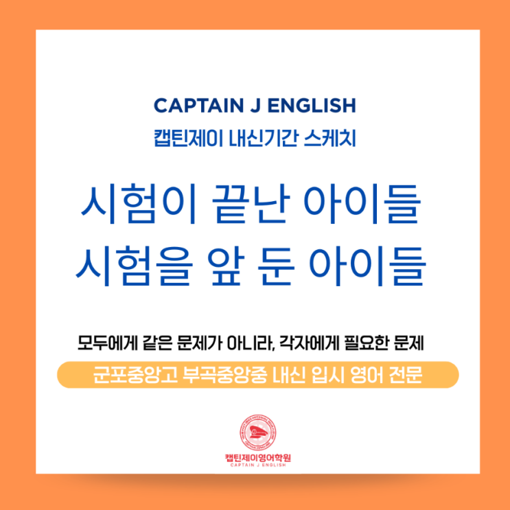 안녕하세요 캡틴제이 영어학원장 Jennifer Jieun Lee입니다. 지난 금요일, 부곡중앙중 영어 시험이 마무리되었습니다. 시험을 보고 나온 아이들의 반응은 한마디로 정리하면 “생각보다 쉽지 않았다”였습니다. 해석은 했지만 선택지에서 헷갈렸고, 분명 배운 내용인데 시험지에서는 낯설게 느껴졌다는 이야기도 있었습니다. 감사하게도 현재까지 확인된 캡틴제이 아이들의 결과는 안정적인 편입니다. 100점을 받은 아이들도 있고, 1~2점 감점으로 시험을 마무리한 아이들도 있습니다. 아이들이 체감하기에 쉽지 않았던 시험에서도 큰 흔들림 없이 결과를 만들어낸 것은, 평소 훈련해 온 방식이 시험장에서 힘을 발휘했다는 의미로 보고 있습니다....... <img src="https://blogthumb.pstatic.net/MjAyNjA0MjZfMTk0/MDAxNzc3MTk3NjMyNTQ3.rVNv1cWvFcyD8qYG08Bv3B2GDShK--rO_RK8EXhAhY8g.yDsjOVjLet0LBketTJeYWUrmVY81I_DfiquVymvsybYg.PNG/900_1_20260426_183517_0000.png?type=s3" />