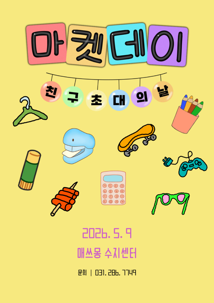 안녕하세요 매쓰몽 수지센터입니다! 우리 아이들이 그동안 수업 속에서 열심히 모은 달란트로 직접 물건을 구매하는 기다리고 기다리던 마켓데이가 돌아왔습니다. 이번에는 단순한 마켓데이를 넘어 친구와 함께 즐길 수 있는 체험형 이벤트까지 준비했어요! 아이들에게는 아주 소중한 시간이 될 거예요! 행사 일정 안내 일시 : 5월 9일 (토) ⭐ 당일 정상수업 진행합니다. 행사 1. 달란트 마켓데이 아이들이 직접 모은 달란트로 문구류, 장난감, 간식 등을 구매하는 시간입니다! 운영시간 : 11:30 ~ 13:30 물품 구매만 참여하는 경우 - 오픈 시간 내 자유롭게 방문 가능하며 구매 시간은 약 10분 정도 소요됩니다. ※ 학부모님 원....... <img src="https://blogthumb.pstatic.net/MjAyNjA0MjJfMzIg/MDAxNzc2ODI2ODcxNjcx.cD5YILBsFS-W1TQjaJFtG8GSIbEQeiRwN4RJyW7n9IMg.QIlgcp0Sp3Qus8gDQxF8HHRy_2UVsxfCXIhTP4NAcpwg.PNG/%C1%A6%B8%F1%C0%BB_%C0%D4%B7%C2%C7%D8%C1%D6%BC%BC%BF%E4..png?type=s3" />