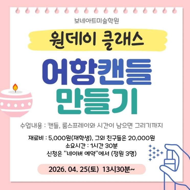 보네아트에서 특강을 진행합니다. 어항캔들만들기 작은 어항캔들 1개와 룸스프레이를 만들어요. 향은 선택없이 1개로 동일이 된답니다. ^^ 그리고 1시간 30분 수업입니다. 재학생은 5,000원, 비 재학생은 20,000원 입니다. 재학생은 4월 수강하고 있는 학생들 입니다. <img src="https://blogthumb.pstatic.net/MjAyNjA0MTlfMjMz/MDAxNzc2NTc5MjkyMTA3.BBQSAjarBzwimi6bVOrl77Ud_jOLrY67XoPuNfn4bzkg.D022exCgS1UenTiR1Fqhy9Fu0_vs8uAq0rFf_reE1jAg.JPEG/900_2.jpg?type=s3" />