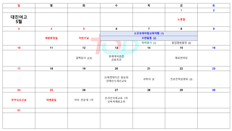 [대진여고영어학원/대진여고수학학원] 대진여고 5월 학사일정 [2026년]