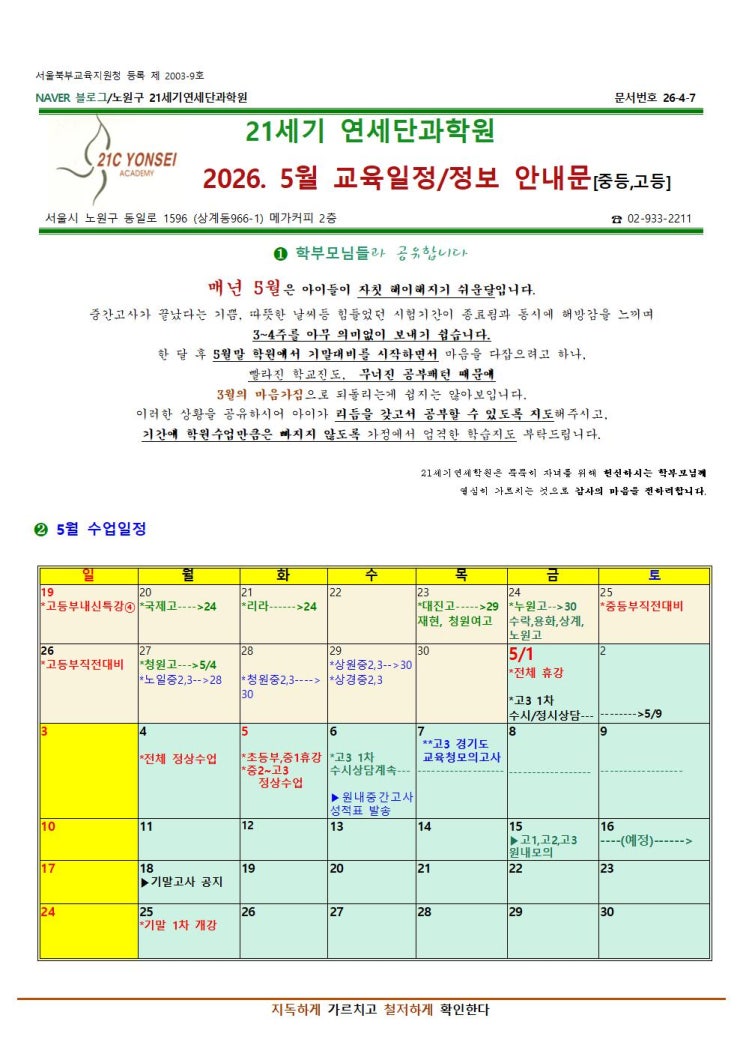 노원구 21세기 연세단과학원 -----5월 일정안내문