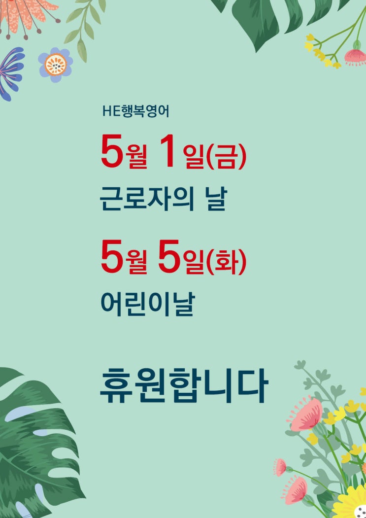 5월 1일(금) 근로자의날 5월 5일(화) 어린이날 휴원 합니다. 5월 25일(월) 부처님 오신날-대체공휴일 휴원 합니다. <img src="https://blogthumb.pstatic.net/MjAyNjA0MjNfMjgw/MDAxNzc2OTE5MjA1NjIx.4GSZp1-JFq6sYeK2XrSCo2F8G1Gx4WQ-8hdVIjYG0Ygg.Wt3odEqekGegUDQSuoTJwxGHu4U4kdwuUWSXLrm7xsQg.JPEG/%BE%EE%B8%B0%C0%CC%B3%AF.jpg?type=s3" />