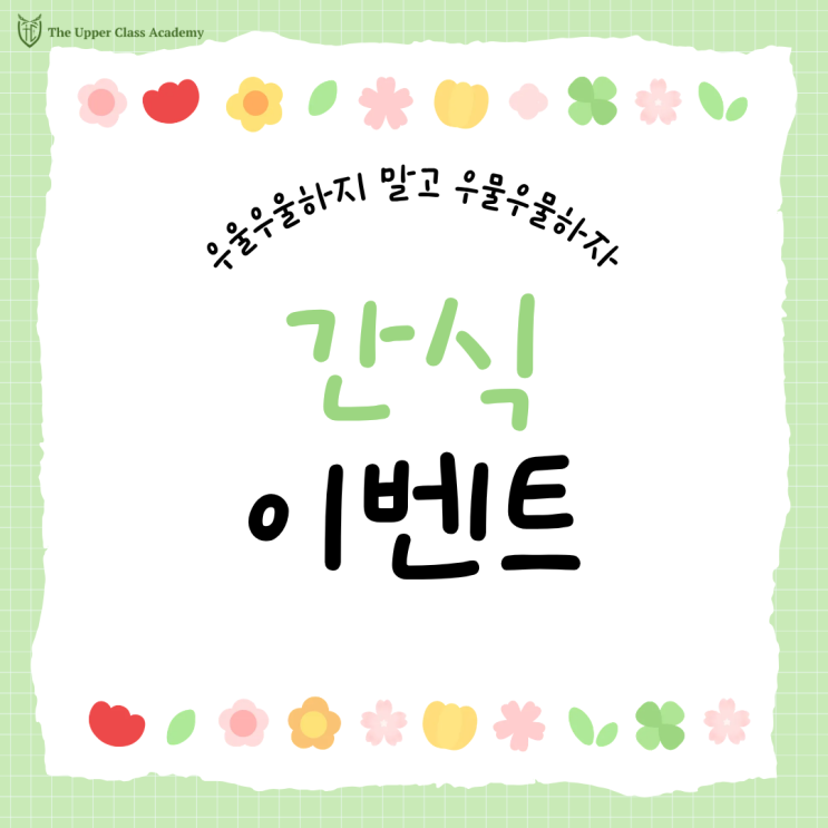 안녕하세요~ 내신, 수능, 입시의 명문 학원 어퍼클래스학원입니다. 중간고사를 앞두고 주말 자습에 열심히 참여하는 학생들. 그 노력을 조금이나마 함께하며 응원하고 싶어서 지난 2주 동안 특별한 간식 이벤트가 연속으로 진행되었습니다. ️ 이번 간식은 저희가 그냥 고른 게 아닙니다. 어퍼클래스 학원은 이번에도 학생들의 의견을 먼저 물었습니다. 4~5가지 후보 메뉴를 놓고, QR 폼을 통해 직접 투표를 진행하였는데요. 투표 하나도 이렇게 진지하게 임하는 우리 어퍼클래스 학생들. 공부도 그렇게 해주리라 믿습니다. 12일 주말 — 핫도그 + 음료수 첫 번째 주말 간식은 바삭바삭한 핫도그와 시원한 음료수였습니다. 핫도그....... <img src="https://blogthumb.pstatic.net/MjAyNjA0MjBfMTc4/MDAxNzc2NjcxODUzODQ4.VHstUCgcMt9uVkYidtkoxDIzPE7fK9dXKgU8VESGeGYg.ylV0Efa1BV4KSNaiysbAmSIHSuy8K1LjhSkf14M8B1Yg.PNG/%B0%A3%BD%C4_%C0%CC%BA%A5%C6%AE_%BA%ED%B7%CE%B1%D7.png?type=s3" />