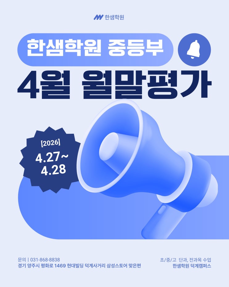 “우리 아이, 지금 수준에 맞는 수업을 듣고 있나요?” 덕계 한샘학원 중등부는 학년별로 여러 반을 운영하여 ✔ 상/중/하 레벨별 맞춤 수업 가능 ✔ 아이에게 맞는 속도와 난이도로 학습 진행 중간고사가 없기 때문에, 학생들이 나태해질 가능성이 있습니다. #덕계한샘학원 은 긴장감을 주기 위해, 기말고사를 곧 대비하기 위해 반배치 고사를 진행합니다. 4월 27일~28일 월말평가를 통해 현재 실력을 정확히 진단하고, 다음 학습 방향까지 잡아드립니다. 지금이 실력 차이를 만드는 타이밍입니다. 상담문의: 031-868-8838 <img src="https://blogthumb.pstatic.net/MjAyNjA0MjNfMTU1/MDAxNzc2OTExOTM1NTY2.xXHLAQgiaRR4ePsdS_-T3nR4SqfDF6Hy1QAHYEVpL9Qg.73JX_cVMfq15RyPHJ6ChpA_H9PBNsyo8yhyHlznpQNkg.JPEG/KakaoTalk_Photo_2026-04-23-11-34-39_001.jpeg?type=s3" />