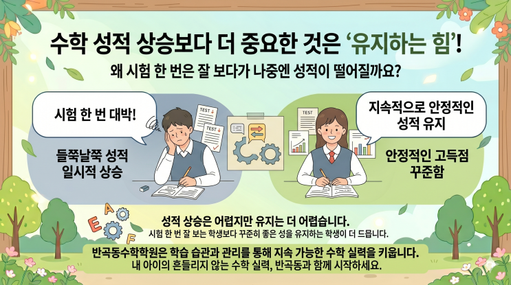 안녕하세요. 맥수학학원 입니다. 수학 성적을 올리는 것도 어렵지만 사실 더 어려운 것은 좋은 성적을 꾸준히 유지하는 것입니다. 시험 한 번 잘 보는 학생은 많지만 지속적으로 안정적인 성적을 유지하는 학생은 생각보다 많지 않습니다. 이 차이는 단순한 실력보다 학습 습관과 관리 방식에서 나타납니다. 그래서 반곡동수학학원에서는 성적 향상뿐만 아니라 유지하는 힘을 만드는 학습을 중요하게 생각합니다. 또한 맥수학학원은 학생이 흔들리지 않고 꾸준히 성적을 이어갈 수 있도록 지속적인 학습 관리에 집중합니다. ✅ 이해한 개념을 꾸준히 반복합니다 성적을 유지하는 학생들은 한 번 배운 내용을 그냥 넘어가지 않습니다. 개념을 이해....... <img src="https://blogthumb.pstatic.net/MjAyNjA0MjhfMjIg/MDAxNzc3MzM5MjMyMDc2.DXN6_g-rOjS2tm3d3BR8PLpvHi3CYiy9XhszeJzls9wg.FDnnvVOqOyTw-yX1zAkp0c7rMF52tM1xKJyg7xyCEjIg.PNG/Gemini_Generated_Image_d0u8aod0u8aod0u8.png?type=s3" />