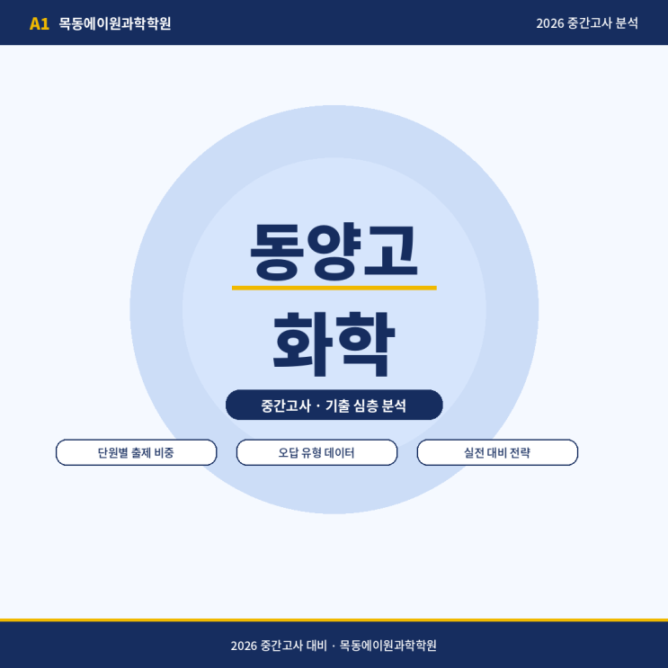 동양고 화학 내신, 이 두 단원이 전체 점수의 72%를 결정합니다 안녕하세요. 목동에이원과학학원 입니다. 동양고 화학 시험이 마무리되었습니다. 막상 문제를 풀 때는 어느 정도 자신 있었는데 결과를 받고 나서 어디서 틀렸는지 감이 오지 않는다는 분들이 많습니다. 이번 글에서는 동양고 화학 시험의 출제 경향, 단원별 비중, 오답 유형을 구체적인 수치로 정리합니다. 이번 동양고 화학 시험, 어떻게 구성되었나 이번 동양고 화학 시험은 선택형 20문항, 서답형 5문항으로 총 25문항 구성이었습니다. 전체 난이도는 중으로 평가됩니다. 킬러 문항은 존재하지 않았고, 전체 문항의 84%가 중 난이도에 집중되었습니다. 하 난이도 3문항(12%), 상....... <img src="https://blogthumb.pstatic.net/MjAyNjA0MjhfMjgw/MDAxNzc3MzU4MTM2OTk1.dmoCiW9yA2AY7NLEfeBE56PjxfnULpdfi1UZqNOOTCQg.tEI0vUbOcdNG-LrWNPwnBcWVrTCOlxXhLcokTFlBdCIg.PNG/%BF%A1%C0%CC%BF%F8%C4%AB%B5%E5%B4%BA%BD%BA_01_%C7%A5%C1%F6.png?type=s3" />