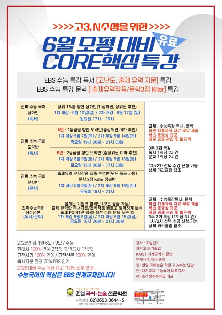 고3, N수생을 위한 6월 모평 대비 핵심 특강 개강(유료)