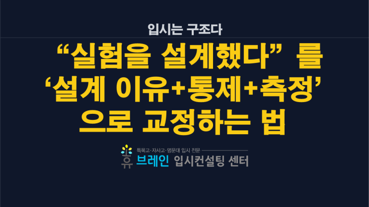“실험을 설계했다”는 문장도 자칫 활동 나열이 됩니다. 결론부터 말하면, 설계는 ‘했다’가 아니라 왜 그 설계가 필요한지가 보일 때 평가됩니다. 대학이 보는 실험 설계의 핵심은 3가지입니다. (1) 설계 이유(질문) (2) 통제/조작 변수(조건) (3) 측정 지표(판단 기준). 이 3개가 한 번에 들어가면 실험이 실제로 진행되지 않았더라도 설계 자체가 학업역량 증거가 됩니다. 설계 문장이 약한 경우는 “준비했다/진행했다”로 끝나는 경우입니다. 반대로 “한 번에 변수 하나만 바꿨다”, “지표를 이렇게 정했다”, “오차를 이렇게 줄이겠다”가 들어가면 설계의 수준이 보입니다. 전/후 교정 전(약함): “실험을 설계해 진행했다.” 후(강....... <img src="https://blogthumb.pstatic.net/MjAyNjA0MjlfMTE3/MDAxNzc3NDM4NjE2OTM5.jgjAaFPPnlHyivOTQKJz8VkL7luQVHF6QmMDUgjbk_kg.JnqVPlnclN8Yyz2xHobW-0n1wRwLwRMIHJ0Np2TkqiEg.PNG/%BA%ED%B7%CE%B1%D7_%BD%E6%B3%D7%C0%CF%28%C0%CF%29.png?type=s3" />