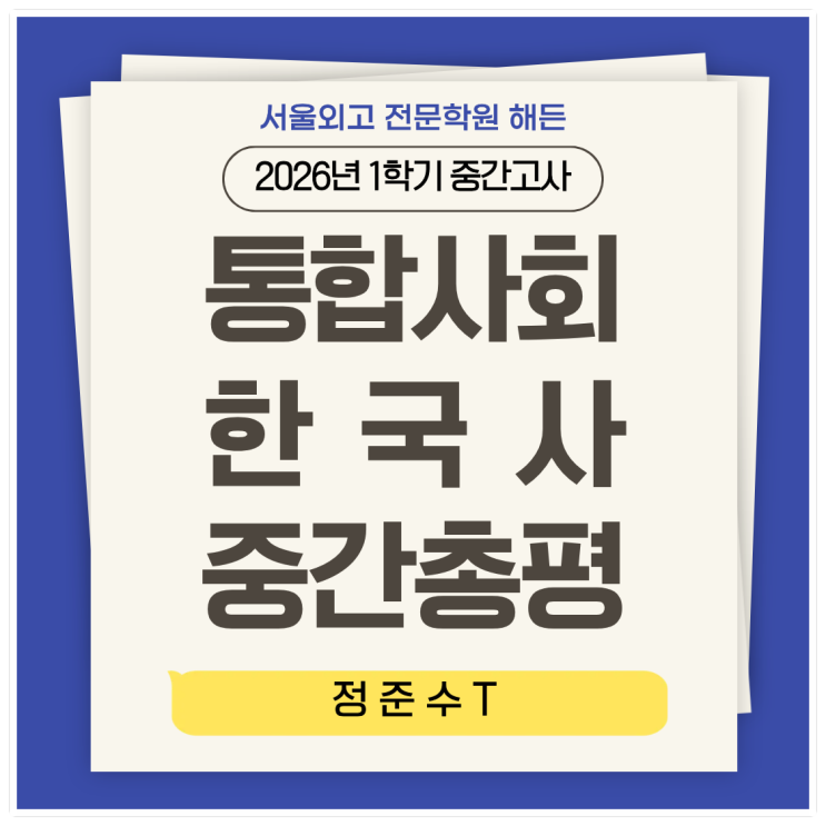 안녕하세요 서울외고 전문 해든학원 입니다. 서울외고 1학년 1학기 중간고사 <통합사회&한국사> 시험 총평을 안내드립니다. ☆ 통사&한국사 정준수T ☆ ☆ 통합사회 1등급 최소 7-9명 배출 ☆ ☆ 한국사 1등급 최소 4-6명 배출 ☆ ▶1. 중간고사 난이도 <통합사회> 난이도 : 중상 - 예상 1등급 컷 : 86 전후 - 예상 2등급 컷 : 70 전후 < 한국사> 난이도 : 상 - 예상 1등급 컷 : 84 전후 - 예상 2등급 컷 : 65 전후 ▶2. 통합사회/한국사 중요성 - 고1 내신 = 국영수 동일 비중 - 고3 수능 = 필수 과목 확정 - 상위권을 원하는 학생, 타과목이 약한 학생 모두에게 가장 전략적이자 효율적인 선택 ▶3. 통사....... <img src="https://blogthumb.pstatic.net/MjAyNjA0MzBfMjUy/MDAxNzc3NTE1NDY4MjQ4.v2Aw00eWo3laSvxXYvY1AeEVKFwUt_YG4rKXJ_ygErUg.TFy6MTsfAtVqryl8B60gYIljQ0GTroj6kTSSaMLAqeUg.PNG/%C1%A6%B8%F1%C0%BB_%C0%D4%B7%C2%C7%D8%C1%D6%BC%BC%BF%E4._%286%29.png?type=s3" />