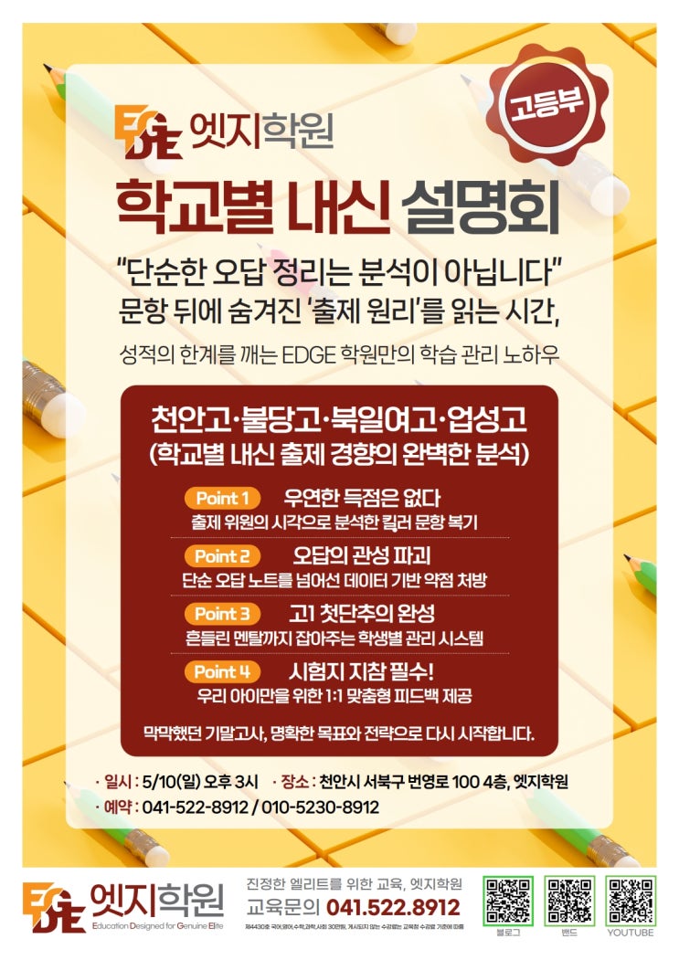 천안고·불당고·북일여고·업성고 기말고사 대비|학교별 내신 설명회 안녕하세요. 천안 불당 엣지학원입니다. 1학기 중간고사가 마무리되었습니다. 시험 기간 동안 최선을 다한 학생들, 그리고 곁에서 함께 마음 써주신 학부모님들 모두 정말 고생 많으셨습니다. 하지만 시험이 끝난 뒤 많은 가정에서 비슷한 고민이 이어집니다. 열심히 공부한 것 같은데 왜 점수가 기대만큼 나오지 않았을까? 우리 아이는 무엇이 부족했던 걸까? 기말고사는 어떻게 준비해야 달라질 수 있을까? 이런 고민은 자연스럽습니다. 그리고 답은 공부 시간만 늘리는 데 있지 않을 수 있습니다. 고등학교 내신은 학교마다 출제 방식과 평가 기준이 다르기 때문입니다. 예....... <img src="https://blogthumb.pstatic.net/MjAyNjA0MjlfNjMg/MDAxNzc3NDQ5MTI5OTcw.ifHejyoSOD51PUHxdGu7jW63rTd5Q53pYZjMkV1YUmog.otPbDV68rA42y_u48y92lw_KyOTqrYy3AU1jaD2P4M8g.JPEG/260424_%BF%A7%C1%F6_%B0%ED%B5%EE%BA%CE%BC%B3%B8%ED%C8%B8_%281%29_1.jpg?type=s3" />