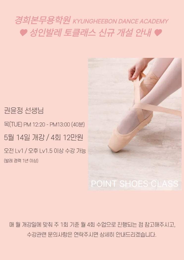 안녕하세요, 경희본무용학원입니다:) 5월부터 시작되는 성인 토클래스 입문반 안내드립니다 탄탄한 기본기를 바탕으로 수업 전 미리 토슈즈를 내 발 모양에 맞춰 만져준 뒤, 슈즈를 신는 방법부터 시작하며 바르게 서서 토슈즈의 기초를 배워볼 수 있는 입문반입니다 발등과 발목에 힘을 받아 토 업할 수 있도록 하는 연습단계로 발 끝으로 서는 아름다움을 경험해보세요 ▪️준비물: 개인용 토슈즈 + 토패드 ✔️토슈즈 구매 전 선생님과 충분히 상담 진행 후, 오프라인샵에서 신어보시고 구매하시는 것을 추천드리겠습니다 ♥️ 차주 4/27(월)부터 신청 받으며, 천천히 고민해보시고 도전해보세요 ♥️ 정원은 4명, 40분씩 진....... <img src="https://blogthumb.pstatic.net/MjAyNjA0MjNfMTc3/MDAxNzc2OTI4NTM2NTMw.jBmyrRq86cuBc57iR0-HlqkwaYfa09VToPt0GN0oJWMg.MBJEyYPjhF845Z-IM6ER9DVrABEtbYPPskO6k0JS7zkg.JPEG/%C1%A6%B8%F1%C0%BB_%C0%D4%B7%C2%C7%D8%C1%D6%BC%BC%BF%E4._%2812%29.jpg?type=s3" />