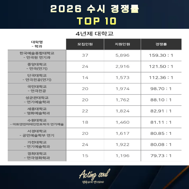 2026학년도 4년제 연극영화과 수시 경쟁률 분석 안녕하세요, 액팅쏘울 안민호 원장입니다. 2026학년도 연극영화과 4년제 수시 경쟁률 TOP30 데이터를 보면 단순히 “높다, 낮다”로 판단하기 어려운 구조가 분명하게 보입니다. 연기입시는 다른 학과와 다르게 학교별 전형 방식, 성적 반영 기준, 실기 유형에 따라 지원자 자체가 완전히 달라지기 때문입니다. 많은 학생들이 경쟁률 숫자만 보고 “여긴 높다 / 여긴 낮다”로 판단합니다. 하지만 이건 절반만 맞는 해석입니다. ✔ 같은 연극영화과라도 내신을 많이 보는 학교 실기 위주로 선발하는 학교 특정 실기 유형을 요구하는 학교 전형에 따라 지원 가능한 학생 풀이 완전히 다릅니다....... <img src="https://blogthumb.pstatic.net/MjAyNjA0MjlfOTgg/MDAxNzc3NDY5ODQ1OTU0.6TURA3orp5KXuRVkUQaEXxXfFTYraFBiwWiJDnRN5rUg.G3qO8taigFezyl-s_GsFJm2c-h3OMV7lll5Il6PuMi0g.PNG/fdshsfdh.png?type=s3" />