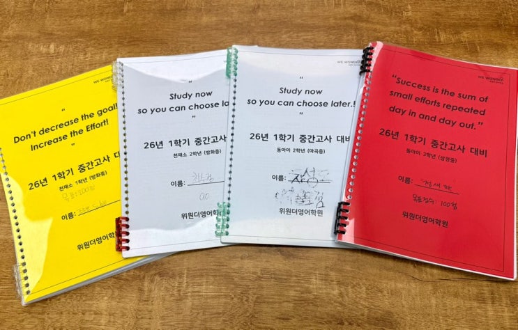 점점 어려워지는 내신 영어, 위원더는 어떻게 준비할까요? 요즘 중등 영어 내신을 준비하는 학생들을 보면, 예전보다 훨씬 더 많은 시간을 투자하고 있음에도 불구하고 결과는 기대만큼 나오지 않는 경우가 많습니다. 지문은 길어졌고, 문장은 더 복잡해졌으며, 문제는 단순히 ‘아는지’를 묻는 것이 아니라 얼마나 정확하게 이해하고, 기억하고, 활용할 수 있는지를 확인합니다. 그렇다면, 지금 필요한 영어 공부는 무엇일까요? 위원더는 내신 기간이 되기 전에 이미 준비가 되어 있도록 학습 구조를 설계합니다. 평소의 습관이 내신 결과를 만듭니다. 위원더에서는 매달 PT Day를 통해 초등부 때부터 ✔ 직접 스크립트를 쓰고, 암기하고 ✔ 발....... <img src="https://blogthumb.pstatic.net/MjAyNjA0MjRfMjk3/MDAxNzc3MDA0NjE0Njk2.lpCEF7-gy23yQLb3UKRQhMJ7-C7GQiqIL9os8qzDrOcg.YsCjAWDuRUrWR6JQTM60grLUPFiyPahZfRm92_oCZ_sg.JPEG/%B3%BB%BD%C5_%BA%CE%B0%A1%C0%DA%B7%E1.jpg?type=s3" />