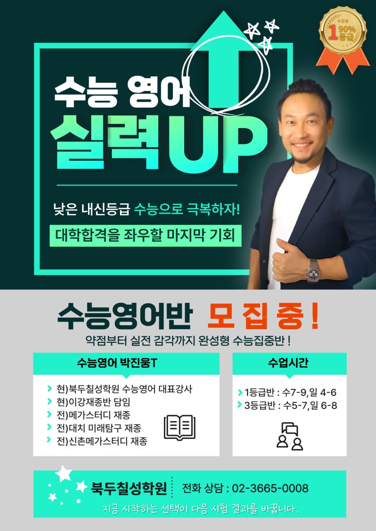 정시준비가 고민이라면 상담하세요 선배들의 압도적인 성적향상으로 입증된 박진웅T 수능영어반 수강생 90% 1등급에 빛나는 박진웅T 수능 영어반 수능준비도 역시 북두칠성학원에서 <img src="https://blogthumb.pstatic.net/MjAyNjA0MDdfMjUw/MDAxNzc1NTQwOTc0OTkz.rIi-5900JnKj9XamcbmBla2FDSlUr-lnDrJiEgtZ6ecg.wNGrmIvIJFedqcthg6yZ52E5OVFC6v5p9PS4D4bAAJQg.JPEG/%BC%F6%B4%C9%BF%B5%BE%EE3-001_%281%29.jpg?type=s3" />