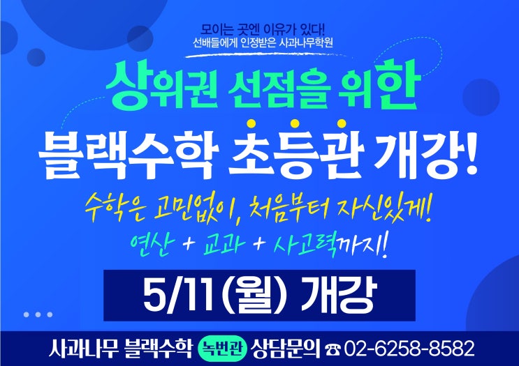 안녕하세요, 성적 상승의 시작, 사과나무학원 녹번관입니다^^ 녹번관에 블랙수학 초등관이 찾아왔습니다! 초등관 신규 개강(초5~초6) 무너지지 않는 수학 초등부터 고등까지, 수학은 사과나무 블랙수학 선배들에게 인정받은 상위권 선점을 위한 중고등/특목/의대 수학 전문 드디어 초등 전문관 확장 오픈 초등 수학, 그 시작부터 사과나무 블랙수학 ❤️블랙수학에서는 연산 · 교과 · 사고력을 통합한 커리큘럼으로 기초부터 심화까지 체계적으로 지도합니다. ✔️ 정확한 연산 훈련 ✔️ 학교 내신 대비 교과 학습 ✔️ 사고력 문제 해결 훈련 이 세 가지를 동시에 진행하여 학생의 수학 실력을 근본적으로 끌어올립니....... <img src="https://blogthumb.pstatic.net/MjAyNjA0MjBfMTMw/MDAxNzc2NjY3ODYxMjg2.ePIN4yv5_T5_X-XrjqiPSTA-l0qH-7Ya7CB7g4u4jDMg.CWrH-KO5z8ereGWkR2GmIobBP0jNrNGWkQ9IMQJyU3Ug.JPEG/%BA%ED%B6%F4%BC%F6%C7%D0%C3%CA%B5%EE%B0%FC%B0%B3%B0%AD.jpg?type=s3" />