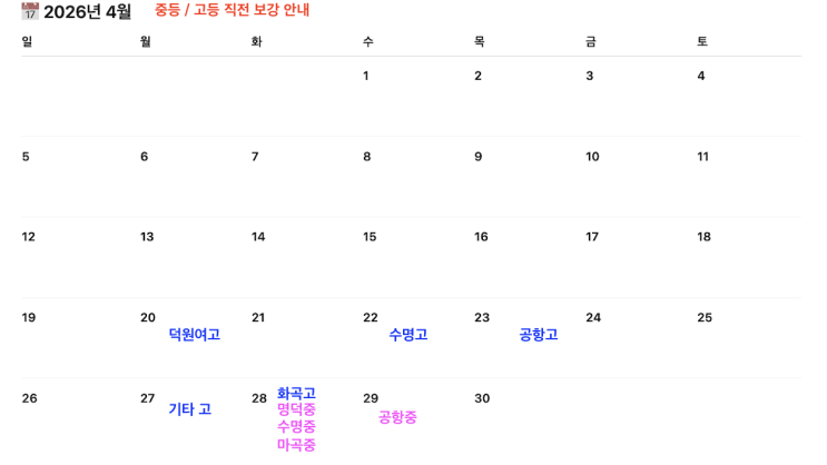 이번 5월은 반이 새로 시작되는 시점입니다. “일정 기준을 두고 반이 구성됩니다.” 이번에 개설되는 반은 중3 / 고1 신규반입니다. 시작은 5월 둘째 주입니다. 특히 고1은 중간고사 직후 가장 큰 변화가 필요한 시점입니다. 그래서 이번 신규반은 이 시점에 맞춰 시작합니다. 신규반 시간은 다음과 같습니다. 기존반 편입 안내 현재 운영 중인 기존반은 다음과 같습니다. 중2 (월/금) 5:00 ~ 7:30 중3 (수) 5:00 ~ 7:30 / (금) 7:30 ~ 10:00 기존반 편입은 상담 및 테스트를 통해 제한적으로 판단합니다. 상담과 확인을 통해 학생을 나누어 배치합니다. 준비가 되어 있는 학생 → 기존반 장이석영어의 기본 처음부터 배우고자 하는 학생 → 신.......