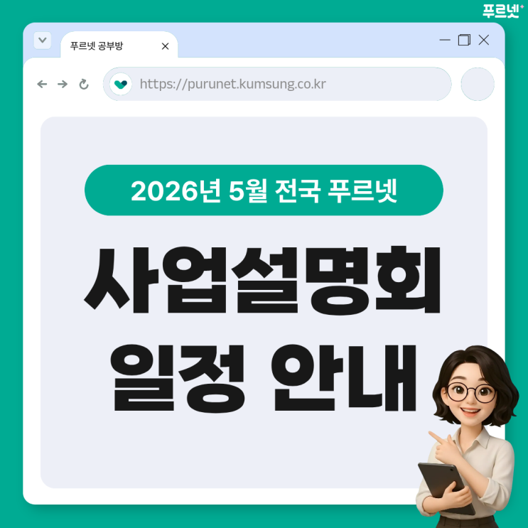 안녕하세요. 푸르넷입니다! “푸르넷과 동반 성장하는 러닝메이트” 540만 명 이상의 회원이 선택한 대한민국 대표 공부방 브랜드 푸르넷에서 함께 성장할 예비 교육 전문가를 모집합니다! 2026년 5월 전국 푸르넷 사업설명회 일정을 확인해 보세요! 540만+ 회원이 만족한 푸르넷만의 학습 콘텐츠! 선생님들의 든든한 지원군 교사 지원 시스템! 시작부터 든든한 비교 불가 지원 혜택! 푸르넷과 함께 동반 성장할 예비 교육 전문가를 기다립니다! 푸르넷과 함께 교육자의 꿈을 펼쳐보세요! 푸르넷은 누구에게나 열려있습니다! ✔️ 일과 육아를 병행하고 싶은 분 ✔️ 출산·육아 후 재취업을 준비 중인 분 ✔️ 나만의 교육 사업을 하고 싶은 분 ✔....... <img src="https://blogthumb.pstatic.net/MjAyNjA0MzBfNzYg/MDAxNzc3NTA4OTIzNjc4.eocp5ri8O_TEPgbSw6Rj4IkkEuQRjz0olTl7IMQooCcg.rI7b6RmWFBsDw1JDSFIYHPYCgA1d6T78VTl0gwvMf-Yg.PNG/1.png?type=s3" />