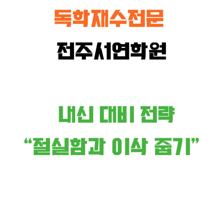 안녕하세요 #전주재수학원 #전주독학재수학원 #전주서연학원 입니다. 많은 중고등학생들이 내신 시험을 준비할 때입니다. 다들 열심히 하는 것 같지만 생각보다 진짜 열심히 하는 학생은 적고, 결국 진짜 열심히 한 학생들이 내신에서 좋은 성적을 얻습니다. 끝까지 열심히 하기 위해서는 "절실함과 이삭 줍기" 전략이 필요합니다. 수능을 준비하는 학생들에게도 필요한 마인드라 모든 전주서연학원 재원생들에게 아래와 같은 내용의 편지를 써서 나누어 주었습니다. 현재 재학생들은 내신 기간으로 내신 준비를 열심히 해야 될 때입니다. 그런데 갑자기 이상한 말들을 하기 시작합니다. “목표가 바뀌었다.” “과목을 다시 바꾸겠다....... <img src="https://blogthumb.pstatic.net/MjAyNjA0MTZfMzYg/MDAxNzc2MzUxNTcyOTYy.kJZdtl6Ia6ZVu3x8ZYPdI44NXtLNDHBxbo7FvTNPC2sg.HbaM2l_KyUcXXd4L5MaRtEc7xK_jqvBl-AKCfHa-Vbgg.PNG/Never_give_up_instagram_post__%282%29.png?type=s3" />