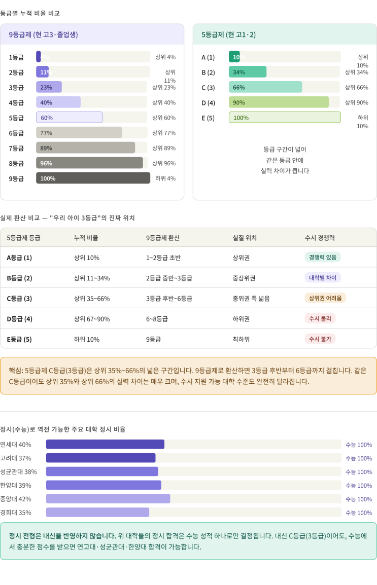 중간고사가 끝났습니다. 성적표를 받아 든 학부모님 중 많은 분들이 이런 말씀을 하십니다. "3등급이면 그래도 중간은 하는 거 아닌가요?" 고1, 고2 자녀를 두신 분이라면 이 질문을 한 번쯤 하셨을 겁니다. 그런데 이 질문 안에 지금 가장 중요하게 짚어드려야 할 오해가 담겨 있습니다. 현재 고2 이하 학생들의 내신은 기존 9등급제가 아닌 5등급제로 평가됩니다. 같은 숫자인 '3등급'이지만, 9등급 체계의 3등급과 5등급 체계의 3등급은 전혀 다른 위치입니다. 이 차이를 정확히 이해하지 못하면, 자녀의 실력을 과대평가한 채 입시 전략을 잘못 세울 수 있습니다. 5등급제 vs 9등급제 — 같은 숫자, 전혀 다른 의미 위 비....... <img src="https://blogthumb.pstatic.net/MjAyNjA0MjZfODkg/MDAxNzc3MjAzODU2Mjk1.XxK_iXMOoD-p57FjmbXaGKVRiK6mEZwLegDPVdFiDl0g.NFxLtf9Xlp0YEhcMaHXOhfeRl-aPrQT7-deOv2xE8A4g.PNG/image.png?type=s3" />