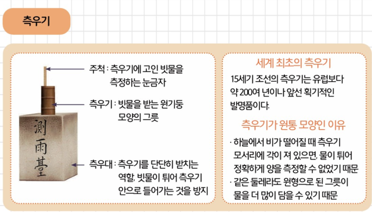 이 수업은 초등학교 1학년 대상으로 진행되었습니다. 안녕하세요 엠베스트SE 학원 오천점입니다. 4월 4주차 수업 주제는 날씨 측정 도구입니다. 앙부일구 키트와 측우기 키트를 조립하고 각 기구를 통해 알 수 있는 것이 무엇인지, 그 중요성은 어떠한 지에 대해 배우게 됩니다. 해당 내용은 초등학교 5학년 과학 과목의 "날씨와 우리생활" 단원과 연계됩니다. 교과 이론 측우기란? 주척의 단위 1척 = 약 200mm 1촌 = 약 20mm 1푼 = 약 2mm 앙부일구란? ※ 앙부일구로 날짜와 시각을 알아보기 ① 날짜 읽는 방법 - 영침 그림자 끝을 손가락으로 짚습니다. - 겨울에서 여름으로 가는 시기에는 오른쪽으로, 여름에서 겨울....... <img src="https://blogthumb.pstatic.net/MjAyNjA0MjRfMjQ3/MDAxNzc3MDE4ODUzMjA4.-au1DohGJvkWIRgByqd-kyERaFqpODNuE7kkpOdKxXcg.V_W2ezqZ4ntjKIQBkk-8IDhoyV7DXkHW_vWCLSx1OV4g.PNG/20260424_142806.png?type=s3" />