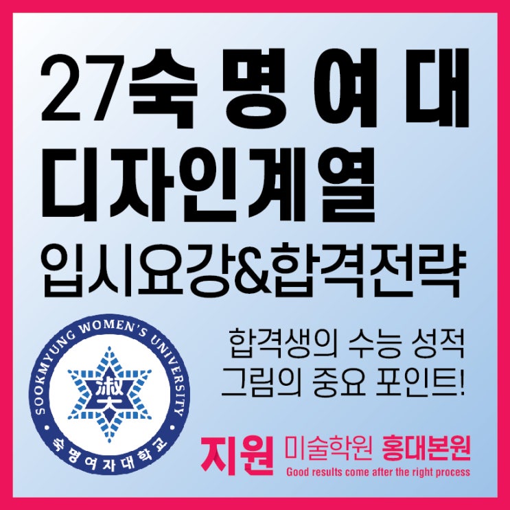 안녕하세요 홍대미술학원 G1지원입니다. 오늘은 지난 포스팅에 이어 27학년도 숙명여대 디자인과 계열 입시요강 그리고 합격 전략을 정리해서 알려드리도록 하겠습니다! 2027 숙명여자대학교 디자인과 입시요강 · 전형 요소 및 반영 비율 → 27학년도 숙명여대 디자인과는 수시 39명, 정시에서 82명 총 121명을 선발하고 있으며, 정시 모집에서는 수능 60% + 실기 40%를 반영하고 있습니다. · 수능 영역별 반영 비율 → 국어 40% + 영어 30% + 탐구 1과목 30% 그리고 한국사는 등급별 가산점을 적용하고 있습니다. [영어, 한국사 등급별 반영 점수는 아래 표를 참고해 주세요] · 숙명여대 디자인과 실기고사 → 숙대 미대 디자인과 실기는 '....... <img src="https://blogthumb.pstatic.net/MjAyNjA0MjVfNzEg/MDAxNzc3MTEyOTIyNDc1.TJi0ZxHr6TqMuyR155ZwOHfO_UbYH2opEedUuqu8KXIg.xmuN8fuLTPEHx4XO7eLcMc9RXexAOvyioEgOQWb16X4g.JPEG/%BA%ED%B7%CE%B1%D7_%BD%E6%B3%D7%C0%CF_27_%C0%D4%BD%C3-05.jpg?type=s3" />