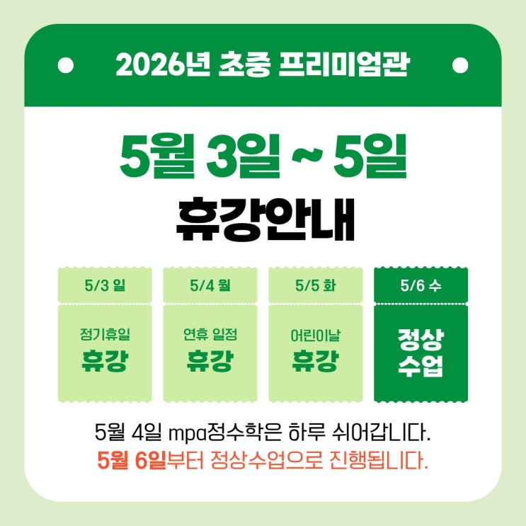 안녕하세요, mpa정수학입니다 5월 연휴 기간 수업 일정 안내드립니다. 휴강 일정 초·중등부 (프리미엄관) 5월 3일(일) ~ 5월 5일(화) 휴강 5/3(일) : 정기휴일 5/4(월) : 연휴 일정 휴강 5/5(화) : 어린이날 휴강 ❗ 중요 안내 고등부 (대흥관)는 정상 수업 진행됩니다. ※ 혼동 없으시길 바랍니다. 수업 재개 초·중등부는 5월 6일(수)부터 정상 수업 진행됩니다. 추가 문의 사항은 학원으로 부탁드립니다 문의 초/중 프리미엄관 010-2700-2726 고입 대입 입시센터 대흥관 010-2782-2726 엠피에이 정수학학원 ☎ 상담문의 02-365-2726 010-2700-2726 [ 초・중 프리미엄관 ] 서울 중구 만리재로 175 402동 402-4-나....... <img src="https://blogthumb.pstatic.net/MjAyNjA0MDJfMjU1/MDAxNzc1MTIzNzEzNjYz.PBA_EbarQAWWYsJkrF8Y3DMud5Dm2LIWTnlctntPGnEg.jjNtLTqTJ9L8H5brl3PJdkOK8g_69FMUBtpgY3TbcBYg.JPEG/3.jpg?type=s3" />